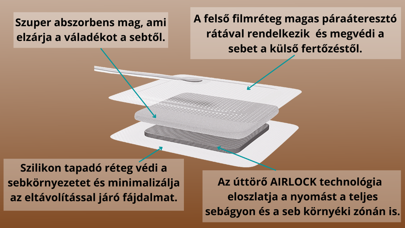 A termék eltávolítja a váladékot és a fertőző anyagokat a sebből elősegítve ezáltal a sebgyógyulást. Na de hogyan is teszi ezt? A PICO◊ 7 készülék negatív nyomást hoz létre és a korszerű kötszer segítségével lehetővé teszi a váladék hatékony kezelését nagyméretű tartály alkalmazása nélkül. A kötszer speciális felépítésének köszönhetően a sebváladék 80%-a elpárolog, a fennmaradó 20%-ot megköti az abszorbens réteg.